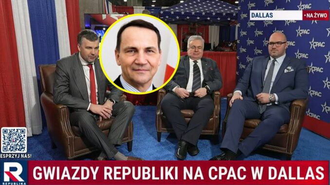 Radosław Sikorski, wicepremier i minister spraw zagranicznych, odniósł się krytycznie do transmisji TV Republika z Conservative Political Action Conference w Dallas. Na nagraniu pojawił się pasek informacyjny z podpisem 'Gwiazdy Republiki na CPAC w Dallas’, w kadrze widoczni byli Tomasz Sakiewicz, Michał Rachoń i Jarosław Olechowski. Sikorski skomentował to na platformie X, pisząc: 'Jakie media, takie gwiazdy’.